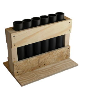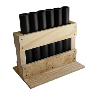 Our mortar racks are constructed utilizing a tested and proven design. The base and side supports are 2X lumber and the rails are 5/8” plywood and OSB. Our mortars are made from high-density polyethylene (HDPE) pipe in either DR11 1.91” or DR9 1.81” inside diameters. Each mortar is plugged with a 1.5″ thick solid wood plug that is secured with staples.